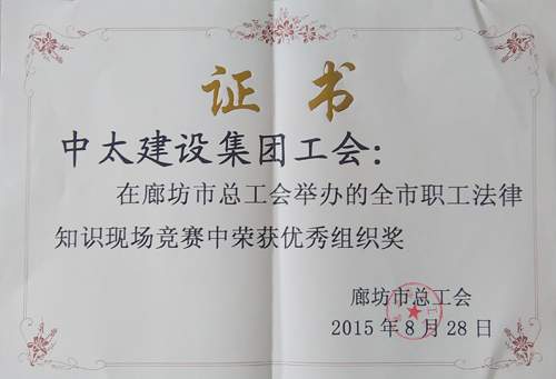 8月28日上午,由廊坊市總工會(huì )主辦、中太建設集團承辦的廊坊市職工法律知識競賽在中太大廈二樓報告廳舉行,來(lái)自全市各縣市區及經(jīng)市總工會(huì )公開(kāi)推薦的市直單位共15支代表隊參加了比賽。經(jīng)過(guò)初賽、復賽兩輪激烈角逐,最終香河縣代表隊拔得頭籌,榮獲比賽第一名,中太建設集團工會(huì )榮獲“優(yōu)秀組織獎”。