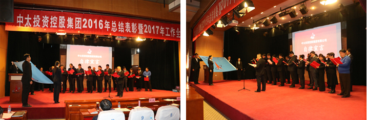 根據會(huì )議安排,中太建設集團副董事長(cháng)燕振義、總裁吳建國作為領(lǐng)誓人,分別引領(lǐng)中太投資控股集團下屬單位董事、監事及中層以上領(lǐng)導干部進(jìn)行自律宣誓,宣誓人分別在誓詞上簽字,并承諾2017年將恪盡職守、奮發(fā)向上,全身心投入到企業(yè)發(fā)展上來(lái),做合格的企業(yè)引領(lǐng)人和決策者。