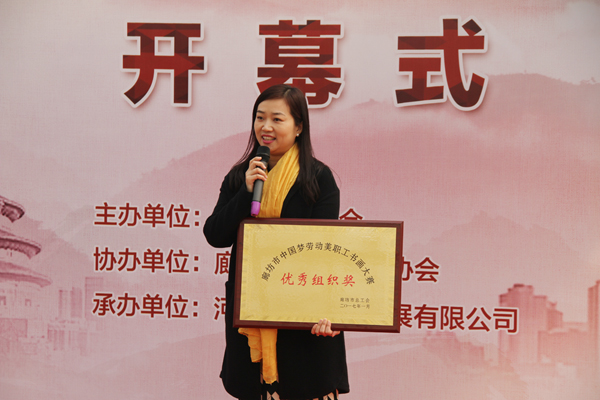 3月16日,“中國夢(mèng)、勞動(dòng)美”廊坊市書(shū)畫(huà)大賽作品展盛大開(kāi)展,開(kāi)幕式上,中太建設集團工會(huì )被授予活動(dòng)“優(yōu)秀組織獎”,集團工會(huì )主席張娟娟代表集團工會(huì )領(lǐng)獎并接受采訪(fǎng)。同時(shí),集團員工李文成、劉翠蘭書(shū)法作品分別獲得優(yōu)秀獎,并與其他獲獎?wù)咦髌芬坏涝诰盘煨蓍e谷展示。