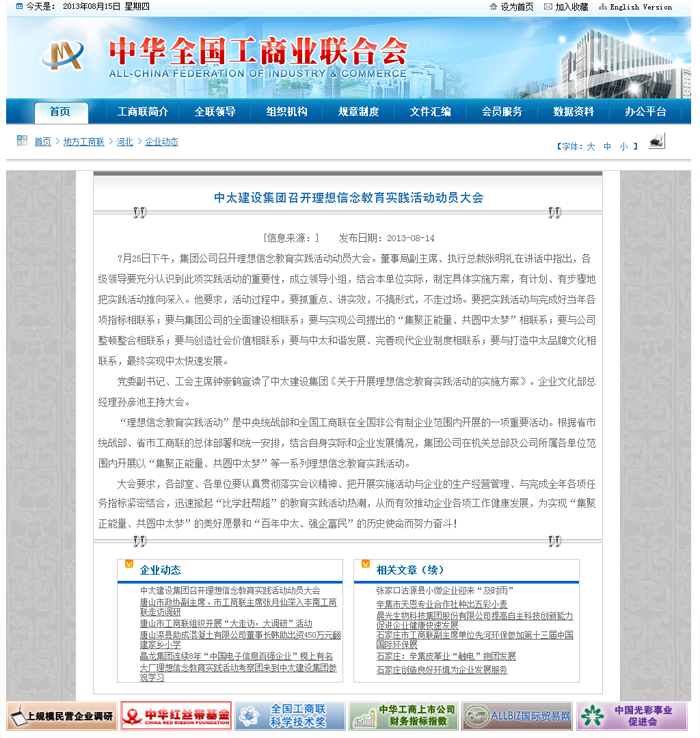 | 全國工商聯(lián)網(wǎng)站8月14日報道了中太建設集團召開(kāi)理想信念教育實(shí)踐活動(dòng)動(dòng)員大會(huì ) |