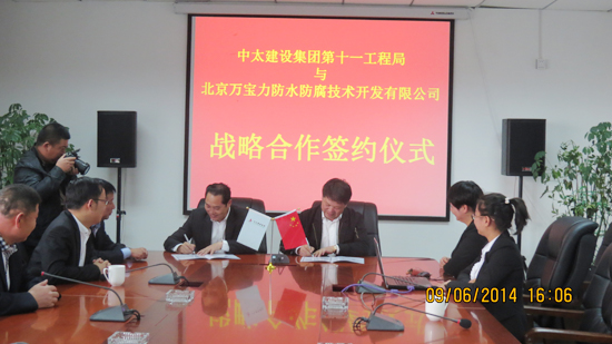 9月6日,中太建設集團第十一工程局與國內防水工程行業(yè)知名企業(yè)——北京萬(wàn)寶力防水防腐技術(shù)開(kāi)發(fā)有限公司簽署合作協(xié)議,確立了防水工程服務(wù)戰略合作伙伴關(guān)系。十一局局長(cháng)馬功云、副局長(cháng)陳可偉、吳夕強以及萬(wàn)寶力公司董事長(cháng)王力共同出席了此次簽約儀式。