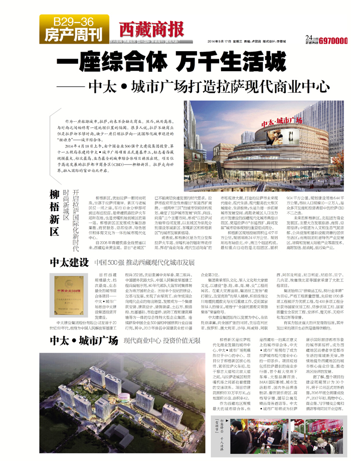 2014年4月18日上午,由中國企業(yè)500強中太建設集團投資、第十一工程局承建的中太·城市廣場(chǎng)項目正式奠基開(kāi)工,標志著(zhù)西藏規模最大、檔次最高、業(yè)態(tài)最全的城市綜合體項目赫然出現。項目位于高速發(fā)展的拉薩都市商務(wù)區(CBD)——柳梧新區。拉薩走向世界,融入國際的窗口由此開(kāi)啟。