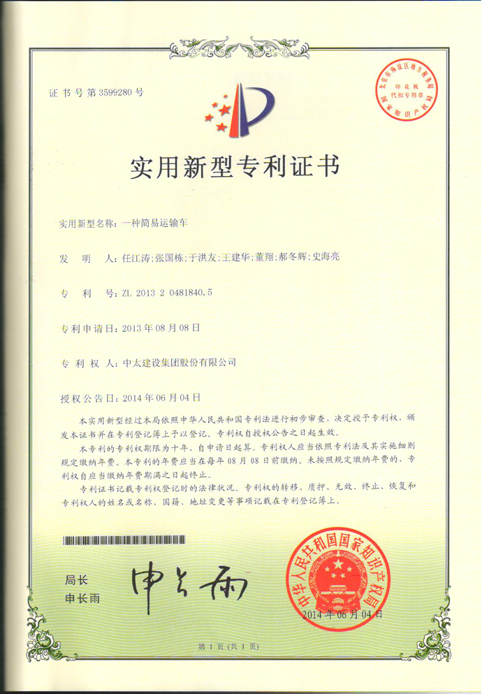 集團公司再獲一項實(shí)用新型專(zhuān)利《一種簡(jiǎn)易運輸車(chē)》。至此,集團公司已累計獲得國家專(zhuān)利十五項,其中發(fā)明專(zhuān)利五項,實(shí)用新型十項。(企業(yè)技術(shù)中心 董翔)