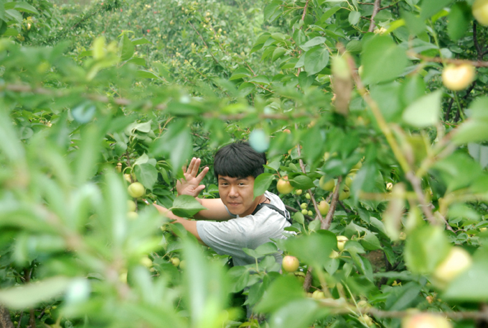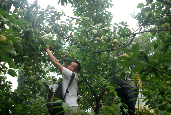 盡管空氣潮濕,路面濕滑,但阻擋不了大家采摘的熱情。面對(duì)著綴滿枝頭的杏兒,大家早就沒有平日里的文雅和羞澀,翹腳、彎枝,瞄準(zhǔn)了那大個(gè)地、泛著紅暈的京白杏兒,熟練地采摘。
